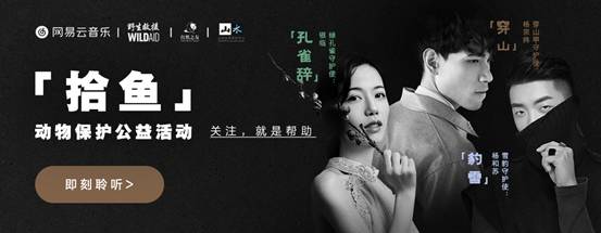 4月8日国际珍稀动物保护日来临之际,网易云音乐联合野生救援、自然之友、山水自然保护中心三家知名公益机构共同发起“拾鱼”动物保护公益活动。活动邀请杨宗纬、银临、杨和苏三位知名音乐人担任公益守护大使,分别演唱《穿山》《孔雀辞》《豹雪》三首公益主题曲;并通过《不打扰,是你最好的温柔》主题H5生动讲述国家保护动物穿山甲、绿孔雀、雪豹不容乐观的生存境况,以帮助大众了解野生动物生存现状,呼吁善待和关怀动物,以绵薄之力守护物种延续。