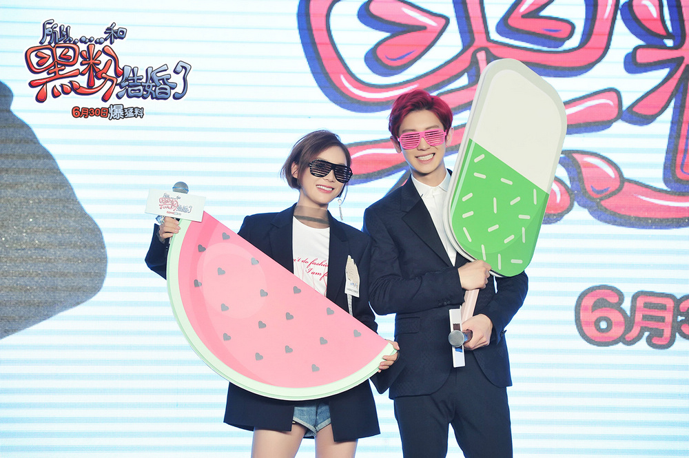 由喜剧者联盟影业、博纳影业、捷成中视精彩联合出品,EXO 成员朴灿烈(Park Chan Yeol)、袁姗姗、姜潮以及韩国“少女时代”成员徐玄主演的爱情喜剧电影《所以......和黑粉结婚了》(以下简称《黑粉》)6 月 15 日在上海举行“笑靥如花,抢滩暑假”发布会,活动 现场高能不断,真假朴灿烈(Park Chan Yeol)首次同台,“手铐 Play”再现人间,为夏日再 添一分灼热,现场还曝光了电影“温情版”预告片,后准与淼淼关系再度升级,“爱与包容” 成为连接两人的纽带。电影《黑粉》将在6月30日揭幕2016暑期档。