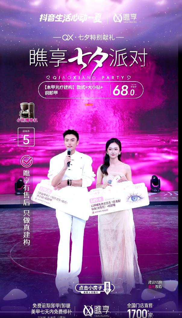 瞧享美甲洞察到年轻人群体“浪漫仪式感”需求爆发,推出“七夕限定情侣系美甲”套餐,通过短视频场景化种草与大型直播限时预售组合,精准触达年轻女性客群。在直播间融入“牛郎织女”IP形象强化中式审美的仪式感,提升直播间点击转化率,覆盖全周期消费人群,深化“节日专属美学”这一仪式感的认知心智。通过七夕营销活动,瞧享美甲品牌搜索指数环比提升41%,直播GMV环比提升38%,订单量环比增长39%,实现品效协同增长。