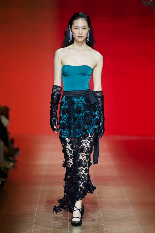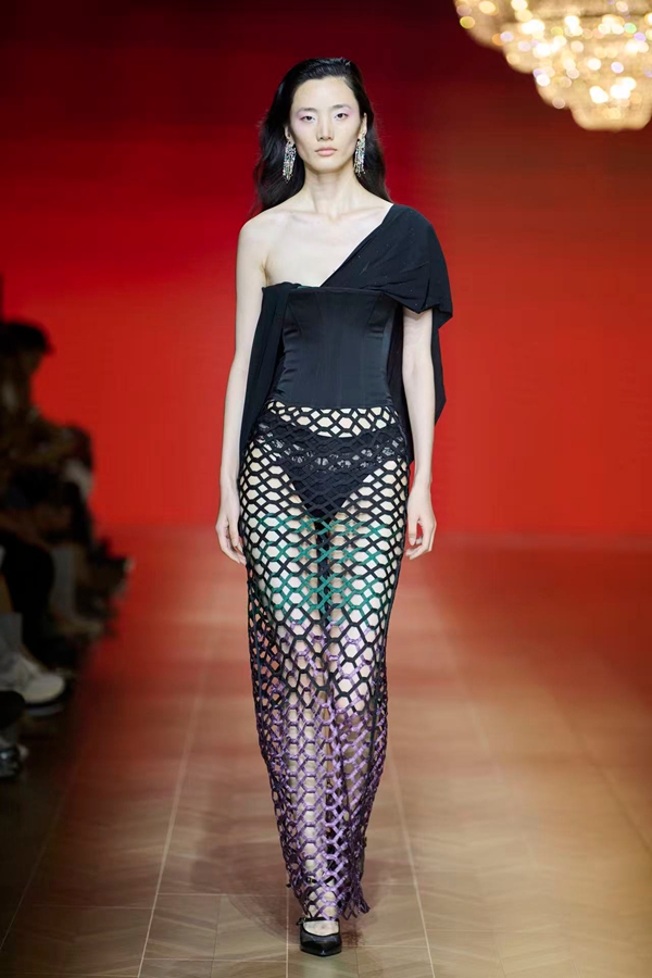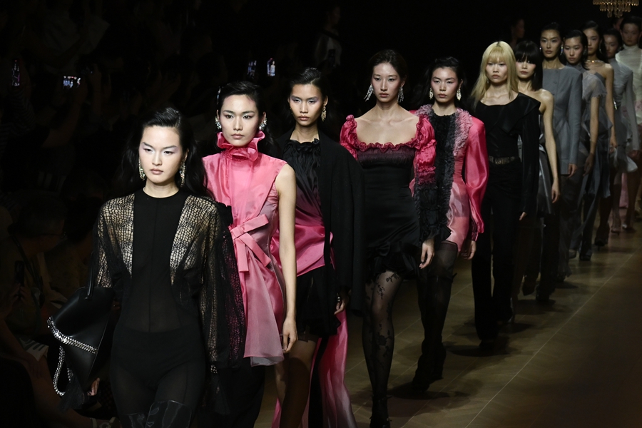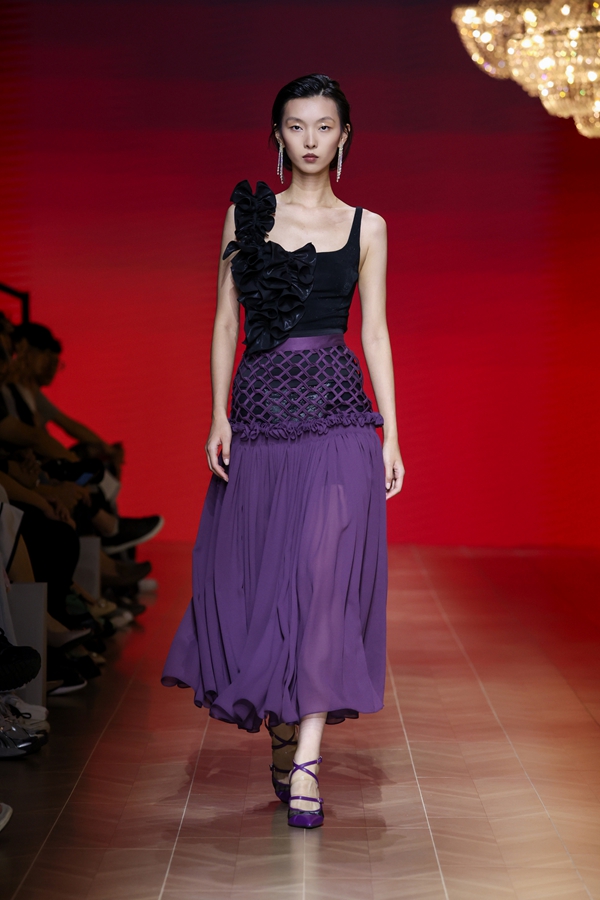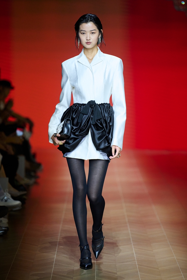 蕾丝、透视、镂空、拼接、褶皱等品牌标识性立体肌理,在新一季趋于稳定且自由,甚至开始变得暧昧。不同于主动营造,而是基础稳固、技法纯熟之后的显化光晕。在此之上,本季在肩部的立体造型刻画上更加积极,使得西装单品质感凸显、强调女性气质的多样性更加明晰;手工串珠的蝴蝶结大量出现,以灵动暗接妩媚的女性化诉求,让性别倾泻的方向更顺理成章;领部薄纱的立体抽褶显现出俏皮的意味属性,打破优雅的稳固又保留了独特的轻微疏离;透视夹杂着拼接或菱形镂空的锐利,将性感演绎得克制又冷静,推翻了单一男频视角的固有状态;蓬蓬裙材质的添加也是本季的亮点,将整个系列隐藏的法式浪漫推向高潮,也向下容接更多年轻客群,年轻化的品牌诉求在细节处一一实现。薄透材质与光泽挺括面料相互碰撞,在时装风格语境里加上防晒服面料等实用功能,黑、粉、灰三色渐次交融,偶尔穿插嫩黄与蓝灰的跳跃拼接,在柔和中藏匿凌烈,成熟的韵味滴入可爱的因子。