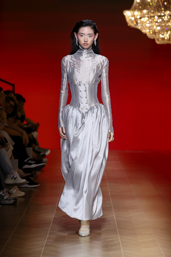 伴随着Cucurrucucu Paloma的旋律,华丽吊灯映照出古典浪漫的氛围,木质地板隐约散发出别样幽香。故事感倾泻而来,开启了品牌CHEN.1988多维的叙事重构。本季色彩不止服务于视觉,更接近情绪表达,陈龙以嫩粉、渐变、跳动的波感来构建全新的色彩谱系,脱胎又区别于之前的用色克制,理想之秋是沉淀于爆发之后的自由步调,为26春夏“腾挪”出让人暗赞的创作空间。