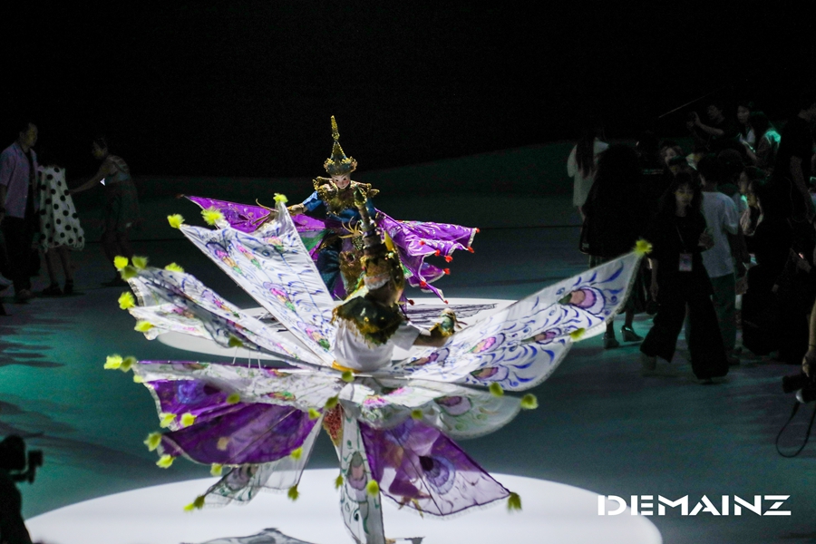 整场大秀通过高性能织物、可转换结构与科技配饰,重新诠释“林茶共生”的古老智慧,并延伸出“机能美学”的当代户外语言。LED光影所勾勒的茶树根系与神鸟舞仪式的当代演绎,结合模特在起伏T台上的多地形演绎,进一步烘托出自然、艺术与科技融合的沉浸意境,凸显地缦品牌在“时尚户外”领域独具前瞻性的探索。