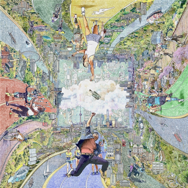 跨界艺术家刘双的《奔流:从上海出发——全球城市人文对话 Our Water: SHANGHAI-LONDON》是一部以同名巨型油画创作为蓝本打造的数字特效预告视频。视频以油画创 作过程为核心线索,既完整呈现了油画本身包含的所有视觉元素——如串联黄浦江、苏州河与泰晤士河的“水”媒介、象征中英新一代的人物形象、 双城标志性建筑等,又通过数字特效镜头的动态转换,将静态油画中的历史脉络、文化联结与人文精神,以更具沉浸感的方式呈现,形成“静态油 画内核+动态数字表达”的跨媒介叙事,为巨型油画创作提供生动的前置预告与多维解读。