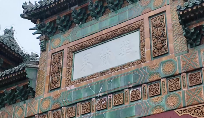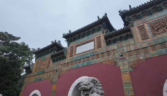 离开静心斋,来到汉传佛教圣地——西天梵境,入口处的 “华藏界” 琉璃牌楼先让人驻足。它以 “四柱七楼” 形制成为园内最大琉璃牌楼,正面“华藏界”标志汉传佛教区域,背面“须弥春”指向琼华岛白塔,门洞框住白塔的“框景”设计,让甘望星惊叹“原来逛公园也藏着这么多学问”。园内核心建筑“大慈真如宝殿”堪称明代遗存的“活化石”:主结构全部由金丝楠木建造,不上漆却因木材天然防腐、抗虫特性保存至今,雨天还能闻到楠木的淡淡清香。