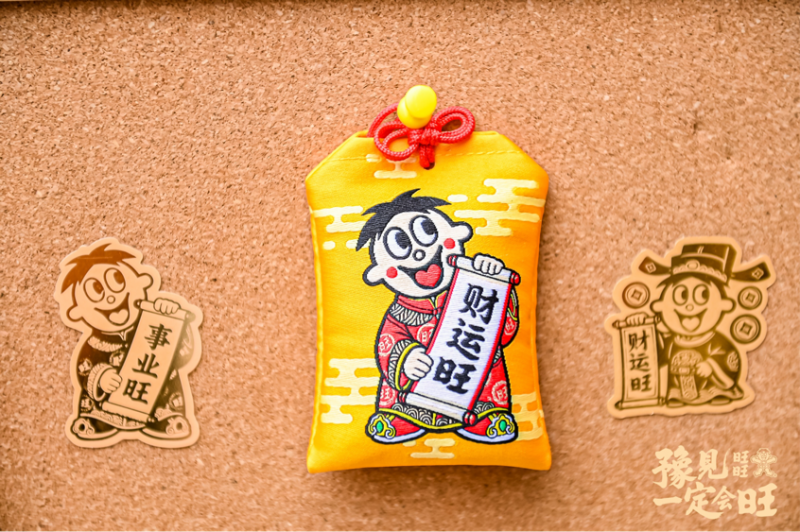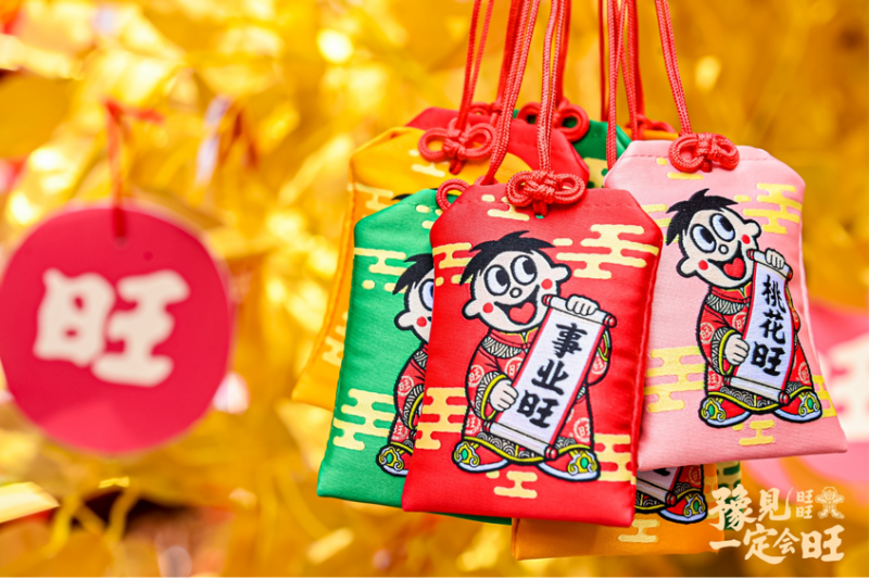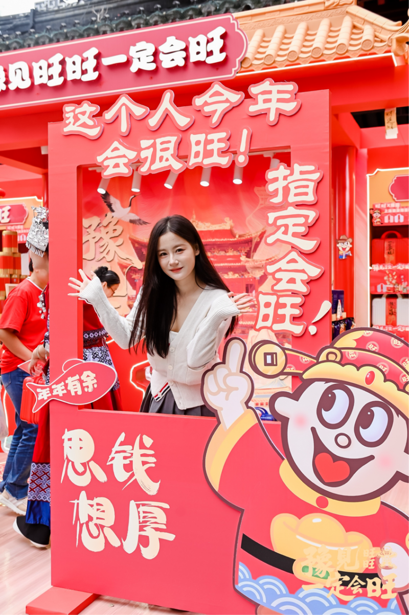 快闪店整体采用中式复古风格,店内正中矗立着立体发光“旺”字美陈,左侧金色祈旺树上挂满雪饼、仙贝造型的祈旺卡;右侧设置“指定会旺”打卡点,财神旺仔人偶指向拍照者,加上“这个人今年会很旺”的标语,成为游客拍照互动最集中的区域。值得注意的是,店内墙面巧妙融入“财运旺、事业旺、身体旺、桃花旺”等文字,将零食消费与年轻人热衷的“玄学祈福”心理绑定。而店外华宝楼二楼高达3米的发光巨型旺仔,更在夜间成为豫园商圈的地标性景观,强化了品牌形象的视觉冲击力。