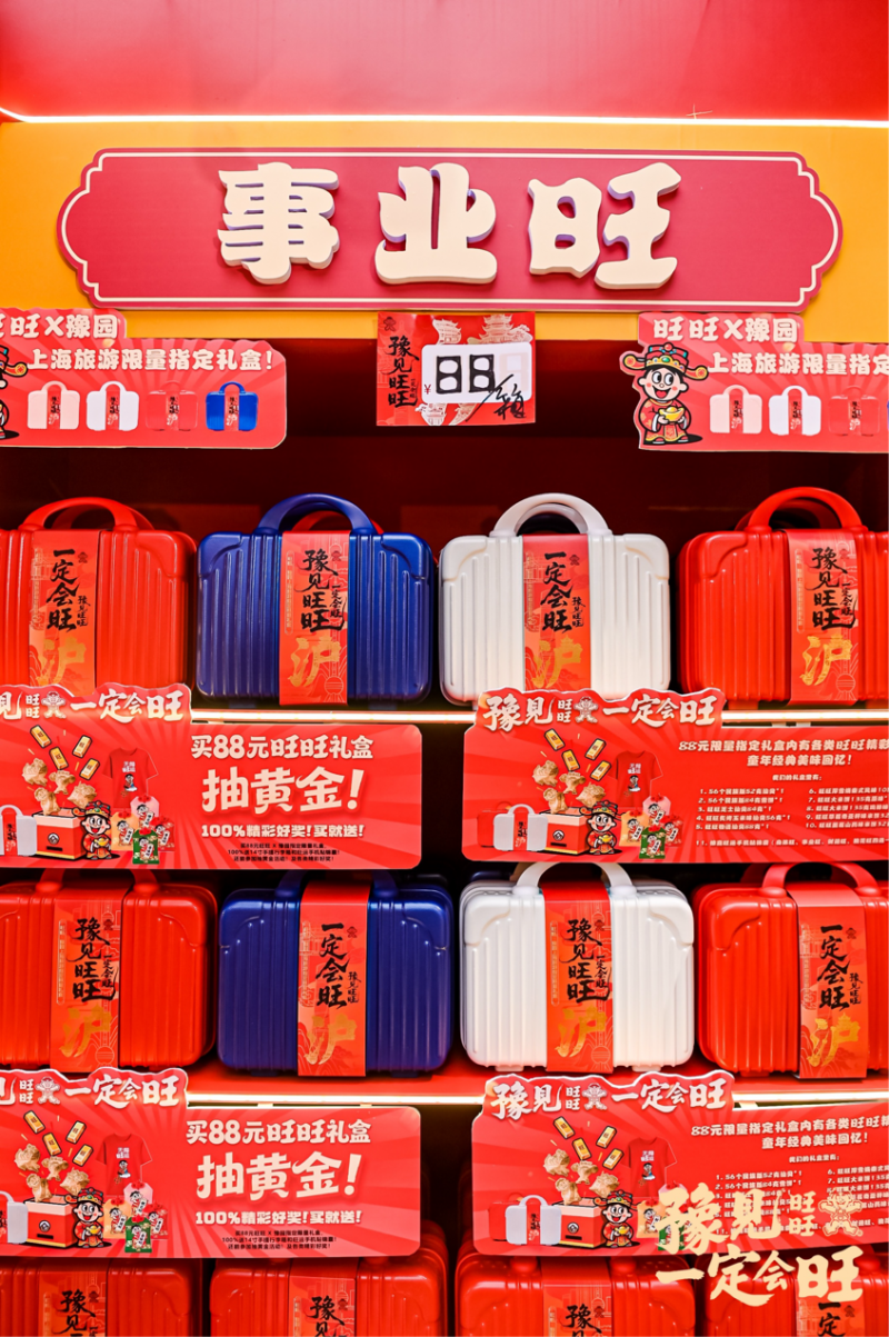 快闪店核心产品“旺旺x豫园上海旅游指定限量礼盒”以红色、蓝色、粉色、白色四种颜色的14寸行李箱为载体,内含10款旺旺米果产品,其中56民族版仙贝/雪饼、芝士仙贝等特色口味凸显了产品矩阵的丰富性。礼盒搭配的“旺运锦囊+手机贴”盲盒设计,则巧妙利用“集齐心态”刺激复购——现场有消费者为获得“财运旺”版本连续购买三套礼盒。而购买礼盒可参与抽金条的活动,进一步放大了礼品的“增值感”,更契合礼品消费需求。