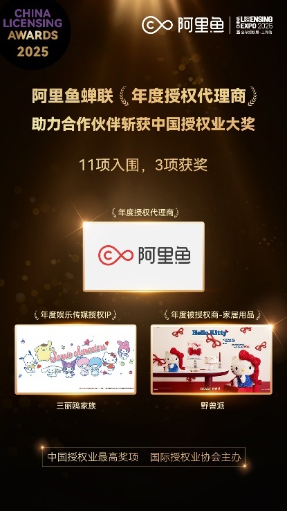 在7月16日举行的2025中国授权业大奖颁奖典礼上,阿里鱼及其合作伙伴喜获行业殊荣。阿里鱼授权项目共有11项入围,其中:阿里鱼蝉联「年度授权代理商」奖项;合作IP三丽鸥家族首次斩获”年度娱乐传媒授权IP”;被授权商野兽派凭借野兽派×Hello Kitty 乖乖坐蝴蝶结永生花荣获“年度被授权商-家居用品”奖。