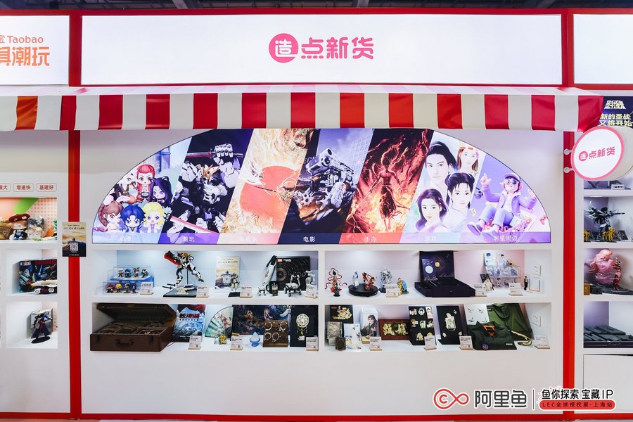 在造点新货展区,《哪吒之魔童闹海》《流浪地球》《长月烬明》《斗罗大陆》《仙剑奇侠传》等影视游戏衍生品创意纷呈,精准还原作品中的人物、场景及道具细节。作为阿里鱼旗下娱乐电商平台,造点新货采用C2M(用户直连制造)模式,实现衍生品与影视游戏内容宣发同步推进,高效转化IP流量为商品销量,现已成为影视版权方授权商品营销的首选平台。其作为《流浪地球2》官方合作平台推出的系列授权商品众筹项目,以上线8天破亿、累计1.5亿元的业绩刷新国内众筹行业全品类销售纪录。