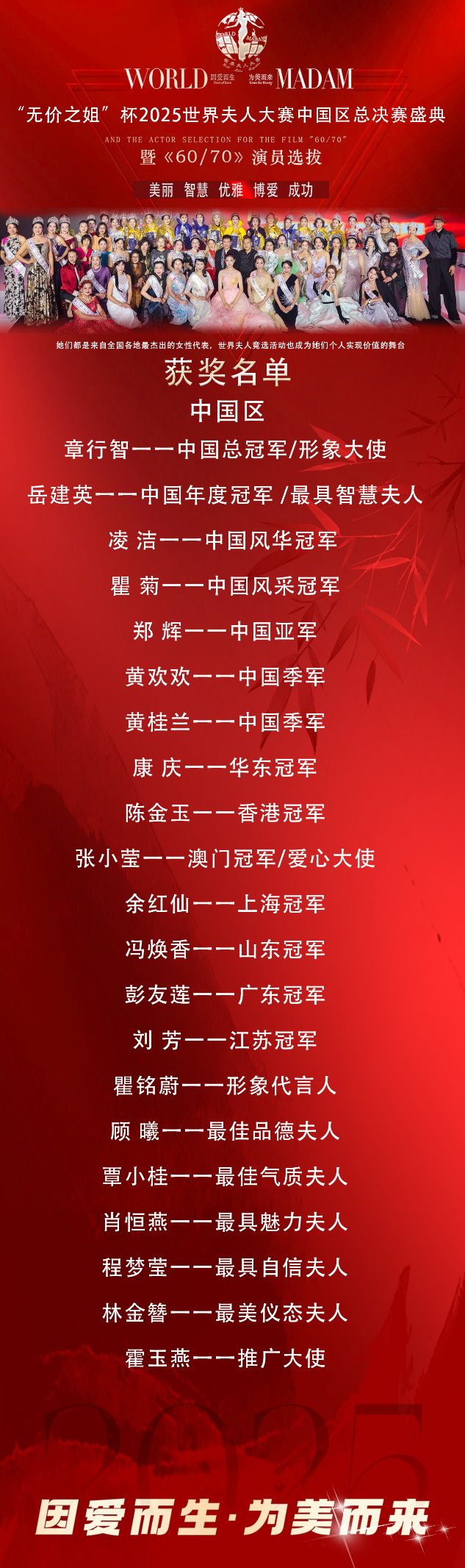 2025年10月28日,广州——今夜,这座素有“花城”美誉的城市,在历史底蕴与现代气息的交融中,见证了一场属于当代女性的高光盛典。由世界夫人(广东)文化发展有限公司主办的“2025世界夫人中国总决赛颁奖盛典暨电影《60/70》演员选拔”于广州盛大举行,并由无价之姐品牌独家总冠名。此次活动不仅是一场美的竞技,更是一次关于女性内在力量与时代精神的深情礼赞。