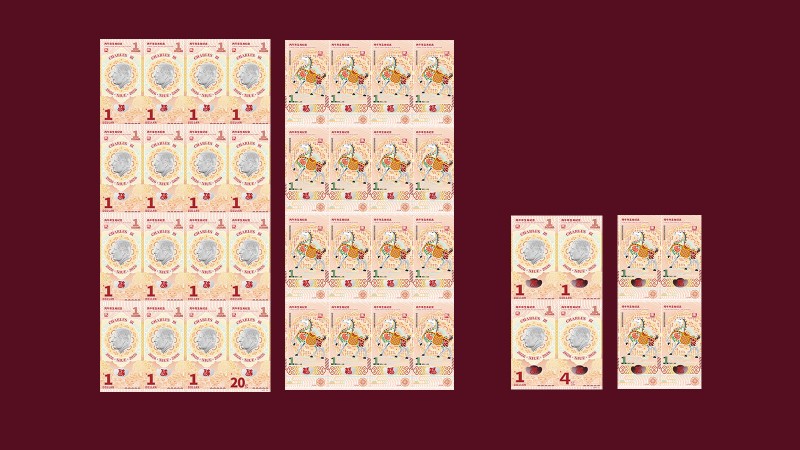“金马奔腾”马年贺岁纪念钞,以连体钞、整版纯银大炮筒形式呈现。正面五花宝驹与牡丹缠枝团纹相伴,寓意富贵荣华,并巧妙藏百福于花中。背面呈现查尔斯三世肖像与灯笼、锦鲤、聚宝盆等吉祥元素,象征财运亨通、幸福安康,并以微雕防伪工艺展现“百福化一”,凝聚祥瑞之意,尽显典藏价值。