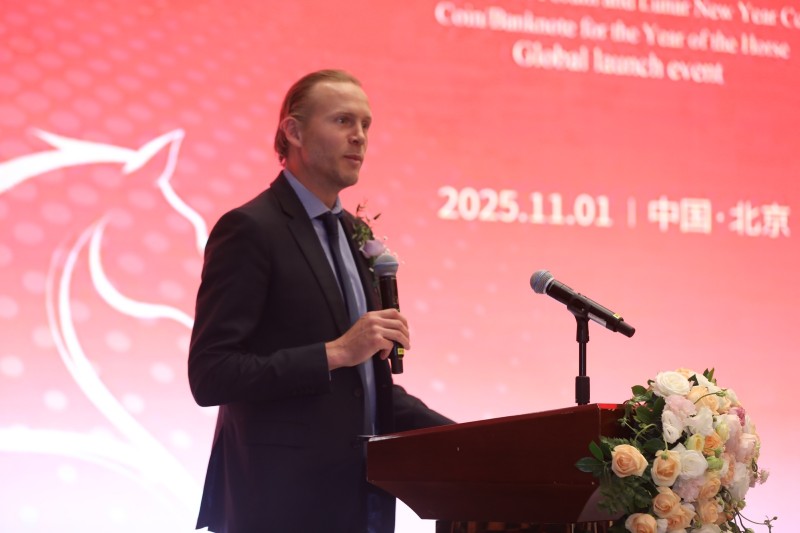 11月1日,为迎接2026中国丙午(马)年来临,弘扬中国传统文化,“天赐鸿福 文明共建” 北京国际钱币论坛暨马年生肖纪念大银币/纪念钞首发式“在北京外交办公大楼举行。全国政协委员、中央文史馆书画院研究员汪国新,新西兰驻华大使馆新西兰贸易发展局商务参赞Joris de Vocht,联合国世界和平文化大使、北京民艺非遗研究院副院长郑桂兰,新西兰造币厂副总裁Tom meek,中国印钞造币总公司正高级工艺美术大师、著名钱币设计家罗永辉,中国工艺美术大师、非物质文化遗产“南阳玉雕”传承人仵孟超,华文促会委员、中国文物学会会员马超出席发布会。