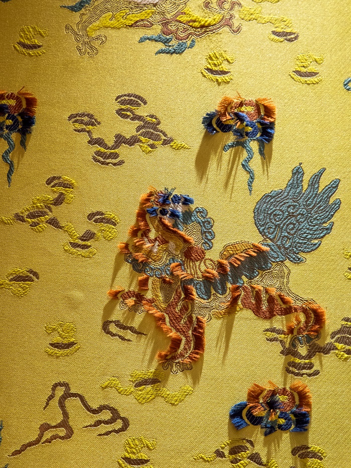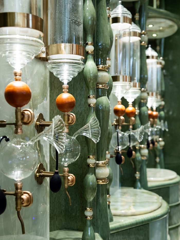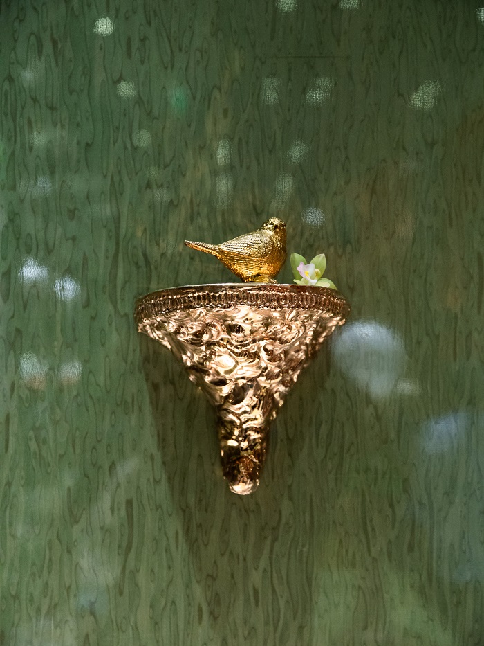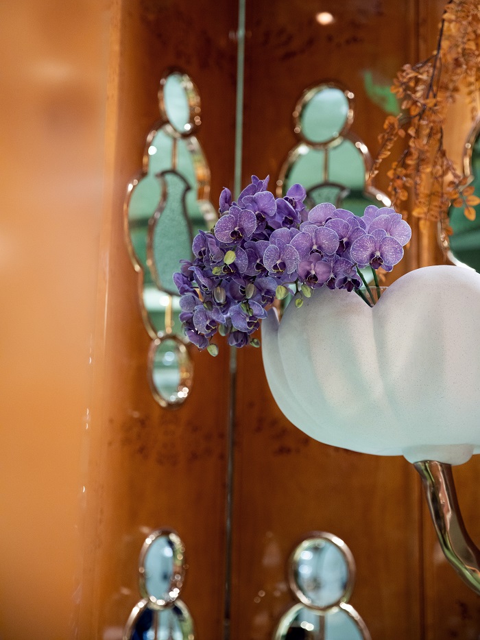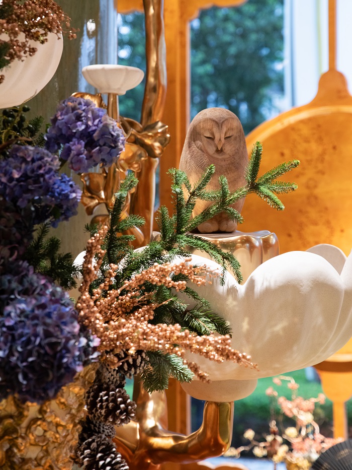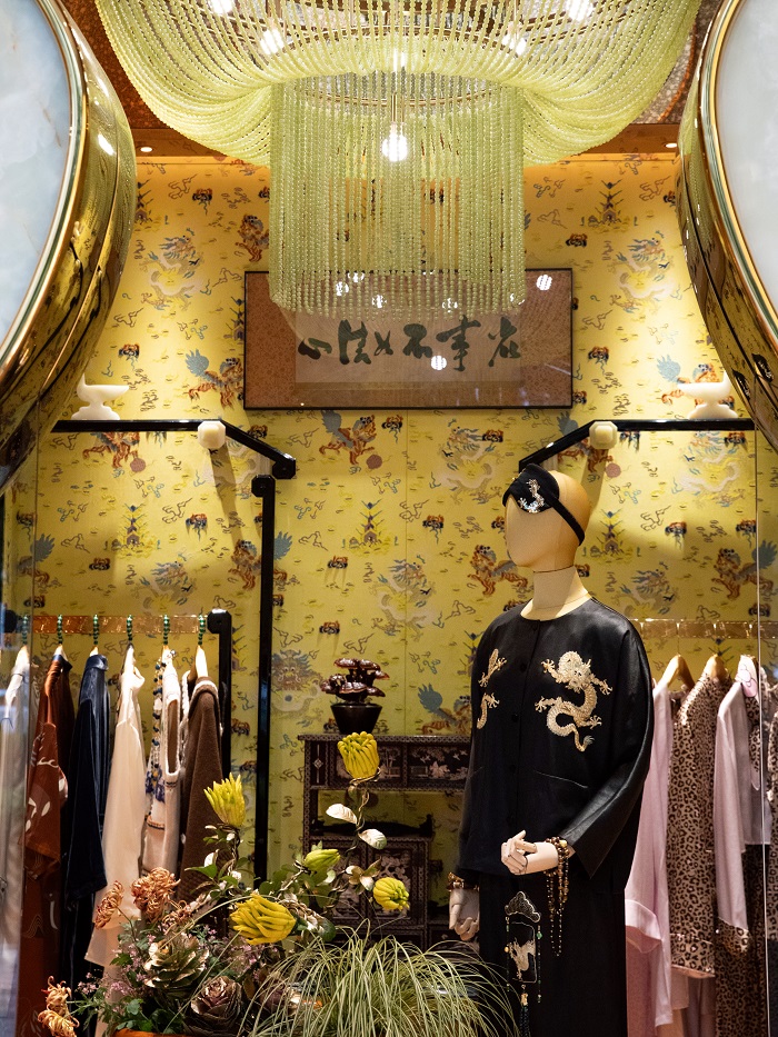 步入店内空间,手绘仙鹤漆画与地面马赛克幼鹤衔珠纹案遥相呼应,可谓俯仰皆景。从隔断式屏风门到柜门把手等,玉瓶元素则大大小小、错落有致地藏嵌于多处细节之中。家居服区,以明黄色麒麟纹样的dedar纺织面料上墙,极具中式韵味的提花与明亮醒目的色彩使得整块区域温暖而不失奢重,与空间内所陈列的宋锦、香云纱刺绣家居服饰等相辅相成。随处可见的插花艺术, 悄然融于店内每处角落,以呈现花的不同形式——几株兰花,室有清香;玻璃辛夷,灼灼其华;玉石瓶花,相得益彰…… 有谓花有百态,美美与共。值此之际,邀你来新店共赏这四时之花,潜入蓬莱一梦。