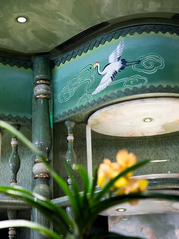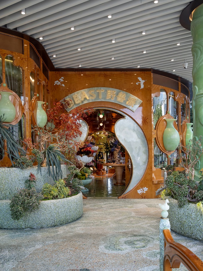 入门处,半开放式园林打破界限,化实为虚,如于曲廊雅轩闲逛,每一处转折都带来新的画面。外立面以鹅卵石为媒,全手工铺就的壁画,一幅闲云悠悠、仙鹤衔珠之景,亦真亦幻;衔接园林与室内空间的半落地环形橱窗外,一排玉石所塑之瓶,集四时风雅,温润如脂。廊内自然花植设计与点缀,使得园林更添生机,如流动画卷,待人寻觅一片雅士心境。