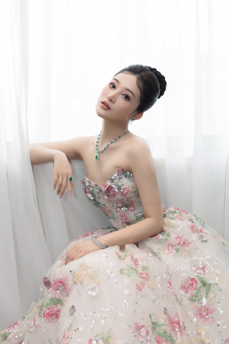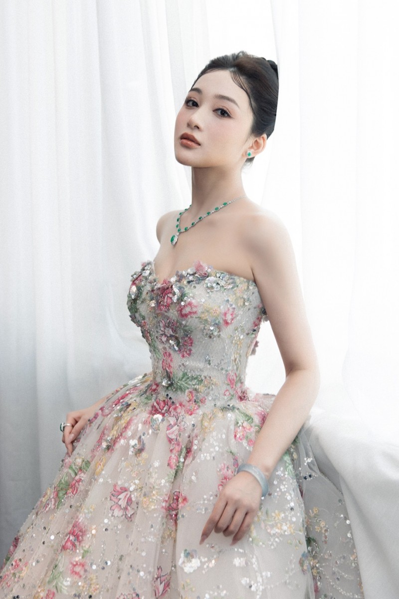 孙嘉璐搭配祖母绿珠宝套装,璀璨的宝石光泽在她的颈间与耳畔流动,与温婉神情相映成趣,散发出一种静谧而坚定的女性力量。