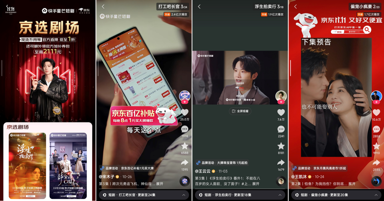 与短剧内容破圈传播同等重要的,是营销玩法创新带来的质效双收——在本次合作中,快手星芒短剧除了提供独家冠名、专属剧场、压屏条、片尾LOGO露出、定制下集预告等常规化权益,使得京东11.11信息多次触达用户;还将京东核心业务场景自然融入其中,借由剧情语境与人物行为实现故事感种草,让品牌价值通过情节被传递、被感知、被体验,完成从“曝光”到“心智”的进阶跃迁。