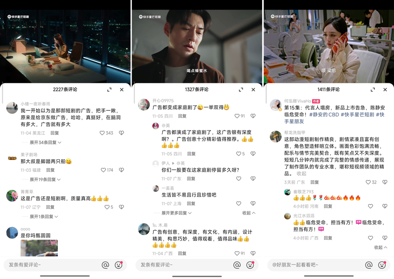 截至目前,京东11.11系列品牌短剧播放量均已破亿,并以多题材、矩阵式、规模化的创新打法,推动着品牌主张和活动信息触达高价值用户。而艺术水准与思想深度双双在线,流量暴涨和种草转化并肩起飞,既是快手短剧内容生态持续丰富的集中呈现,也是快手星芒短剧与达人、明星深度联动商业化模式的又一实践。