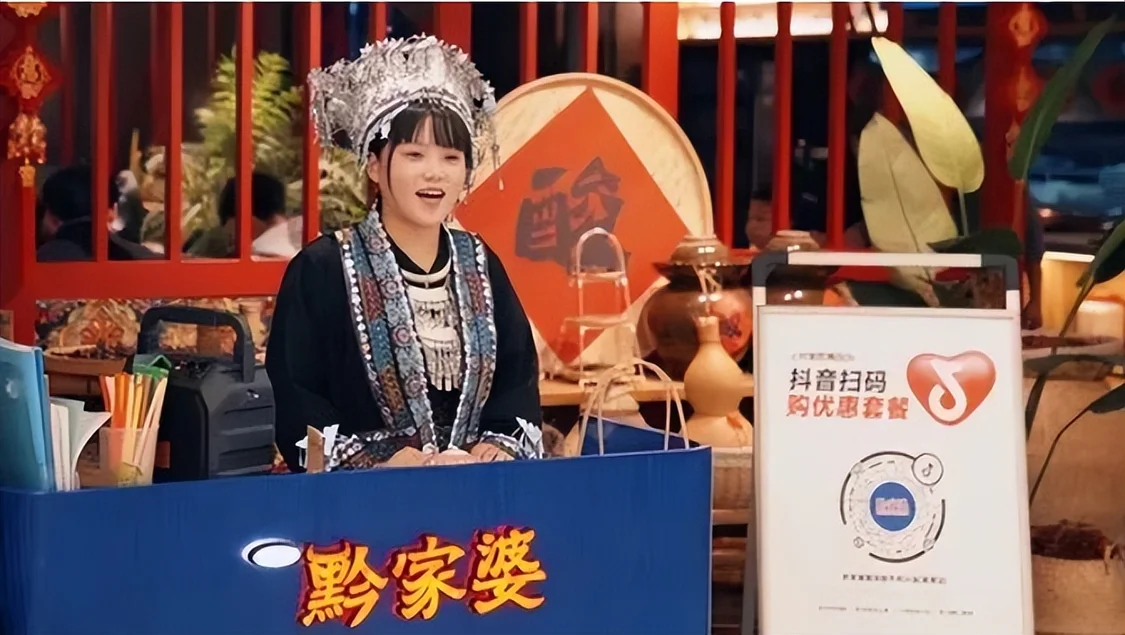 这些贵州老板的加盟店,擅长用充满贵州民族特色的创意玩法在抖音上吸引食客。浙江东阳的一家门店,把贵州特色民俗敬酒礼“高山流水”搬进了店里,再搭配灵动的贵州苗族舞蹈。苏州盛泽的加盟店也富含巧思,店员们身着精致的贵州民族服饰,将民族元素与日常场景结合,在短视频和直播间里直观地展现民俗特色。