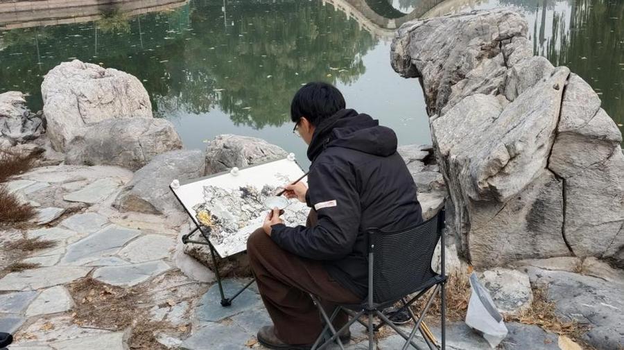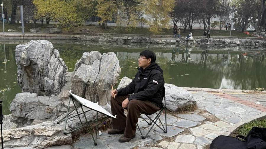 在这场艺术与自然的对话中,主角是青年画家付闻博,他以笔墨为媒介,将龙潭公园的秋景转化为宣纸上的山水意境,让观众亲眼见证一场从自然景观到艺术创作的转化过程。