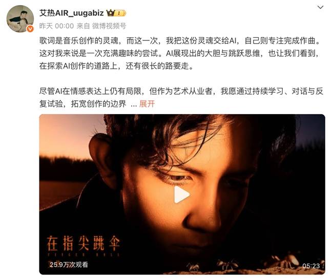这支《在指尖跳伞》MV的发布激发了歌迷无限期盼,翘首以待艾热新专辑《艾·思集》的全面上线,新专辑共计有近20首歌,《在指尖跳伞》是唯一一首AI深度参与创作的作品,是一次实验性的大胆突破,后续歌曲则将回归艾热的内心世界与人性思考,更加聚焦人文关怀和情感共鸣,构建一个硬核又真实、磅礴而浪漫的音乐宇宙。