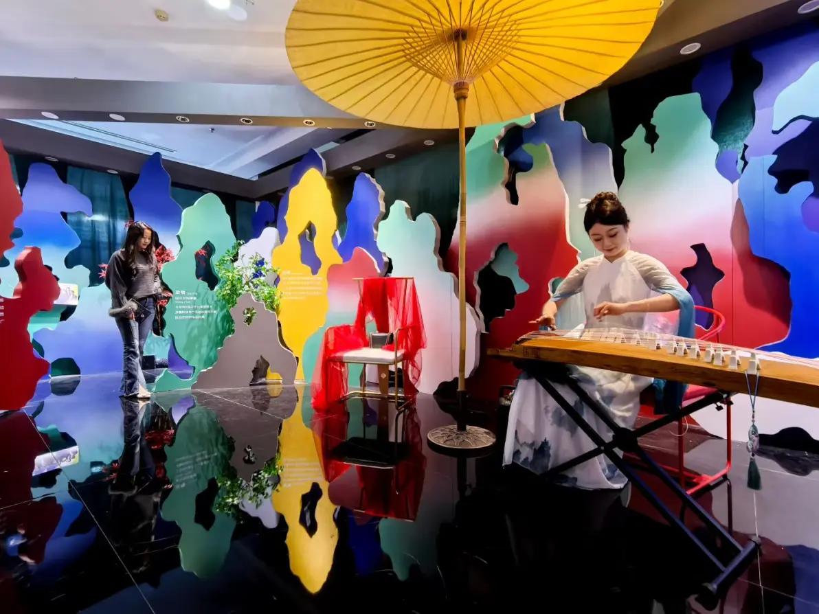 步入展区,曲径通幽的布局与写意灰白的“假山”错落相映,红枫轻摇,纸伞点缀,似推开一扇古画窗棂,悄然跌入水墨秘境。当古筝声起,光影随音律在色彩与肌理间轻盈跳跃,“醛变水”密码与“致敬诺贝尔化学家得主”交相辉映,每一处墙面转折皆暗藏造化的玄机,引人驻足。