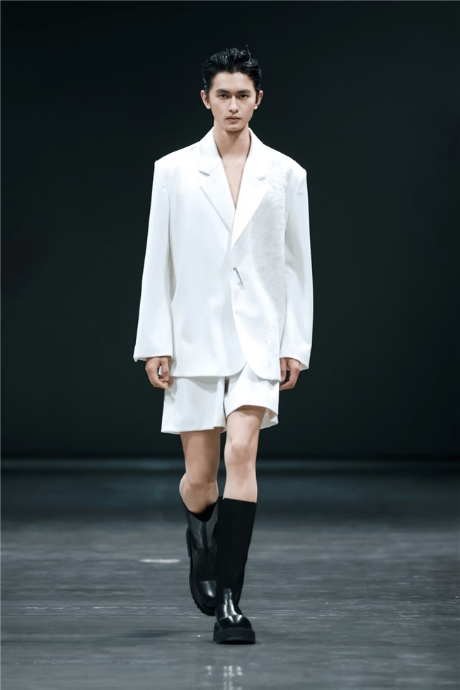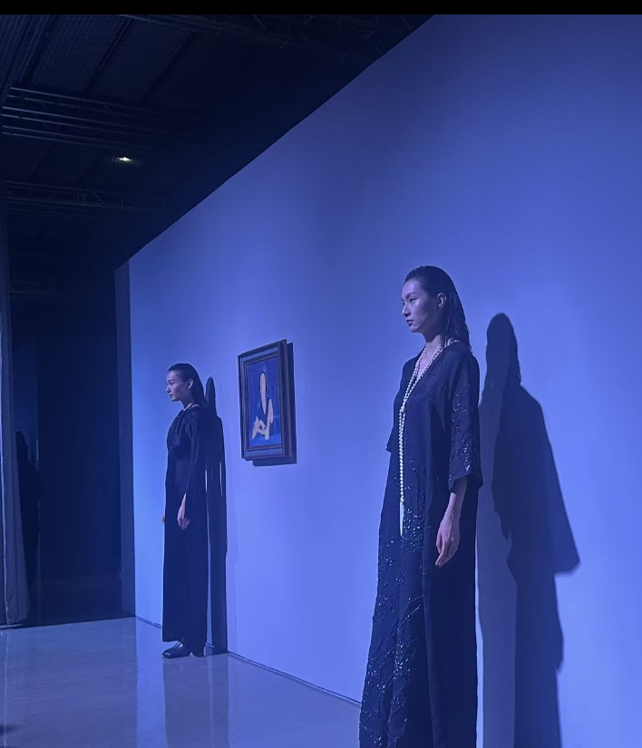 随后,展览步入最引人入胜的篇章。帷幕轻启,模特静立于画作之前。展厅墙面涂覆着房莹独有的时尚色调,画作在框型灯下犹如被点亮的记忆之窗。顷刻间,现实与艺术、动态与静态的界限悄然消融——令人恍惚难辨,是模特步入了二维的画境,还是画中凝固的时光悄然弥漫至现实空间。