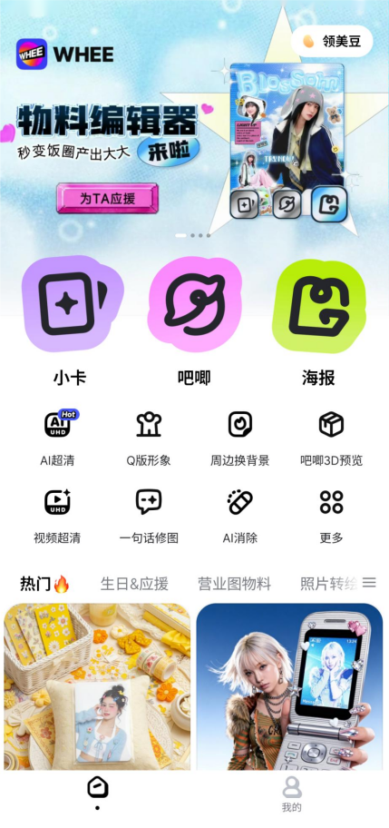 近日,美图旗下产品WHEE正式推出“物料编辑器”功能,覆盖小卡、吧唧、海报等多种物料形态,为年轻追星群体提供一站式的物料制作解决方案,能够轻松创作高质量和个性化的应援作品。