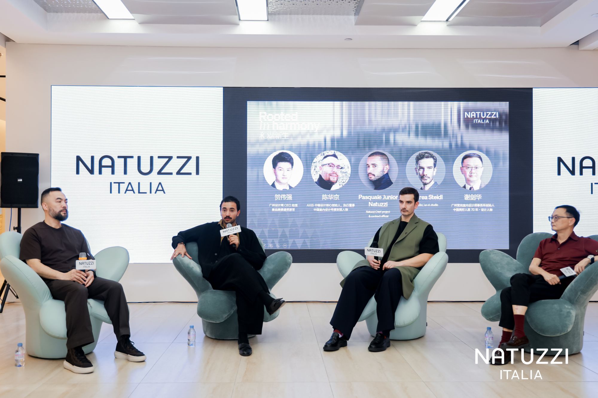 活动现场的跨界论坛环节,成为中外设计理念碰撞的焦点。广州设计周CEO助理贺伟强以“Rooted in harmony”为引,Pasquale Junior Natuzzi、Andrea Steidl、陈华京及谢剑华四位嘉宾,围绕岭南文化与普利亚文化的异同、自然情绪文化在当代生活中的表达,以及产品与空间共创等话题展开深入探讨——无论是意大利的咖啡香还是广东的茶汤味,本质都是“以生活为核心的和谐哲学”。这种共鸣在设计师的实践中尤为明显。