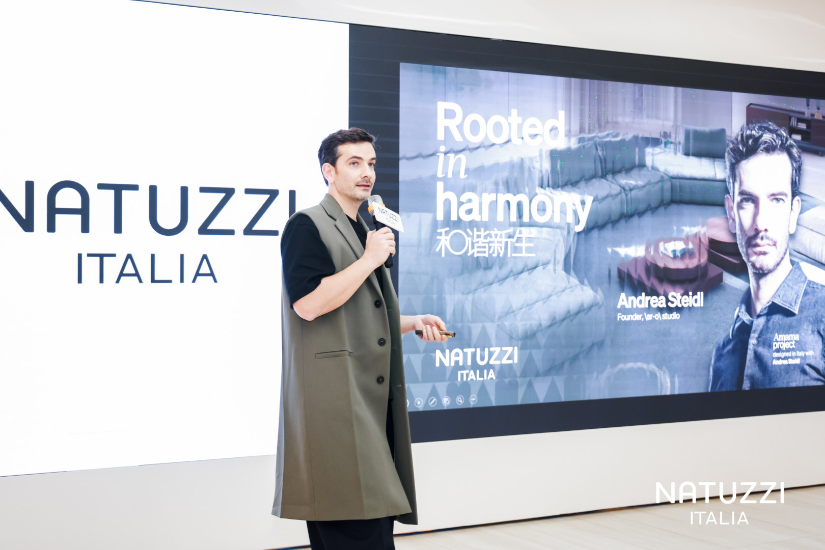 活动伊始,Natuzzi Italia便清晰传达了其核心精神。品牌中国区总经理王勇阐释了“Rooted in harmony”的深刻内涵:这一主题不仅是2025年的年度主张,更是品牌长达11年“Harmony Makers”理念的延续与升华。在全球化浪潮与社会快速变迁的当下,NATUZZI纳图兹选择回溯66年前始于意大利南部普利亚大区的品牌根源,旨在将历史价值与面向未来的崭新动力交织融合。核心符号“Radice”(意大利语,意为“根”),既象征着品牌身份及其与故乡土地的深厚联结,也寓意着家人、朋友紧密团结、共创美好生活的愿景。
