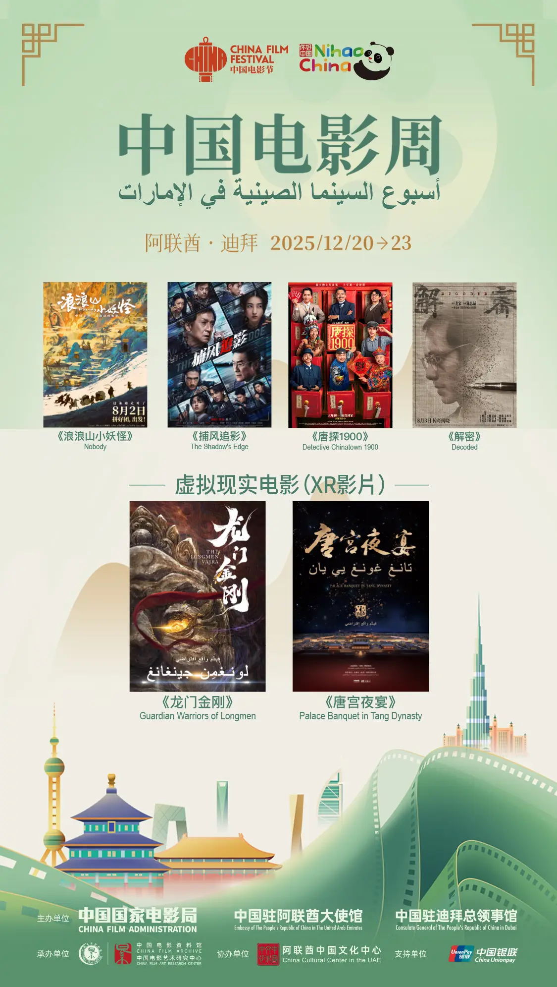 2025年12月20日,第七届“阿联酋中国电影周”在迪拜正式开幕,活动由中国国家电影局、中国驻阿联酋大使馆及中国驻迪拜总领事馆联合主办,中国电影资料馆承办,阿联酋中国文化中心协办,由中国银行特别支持。