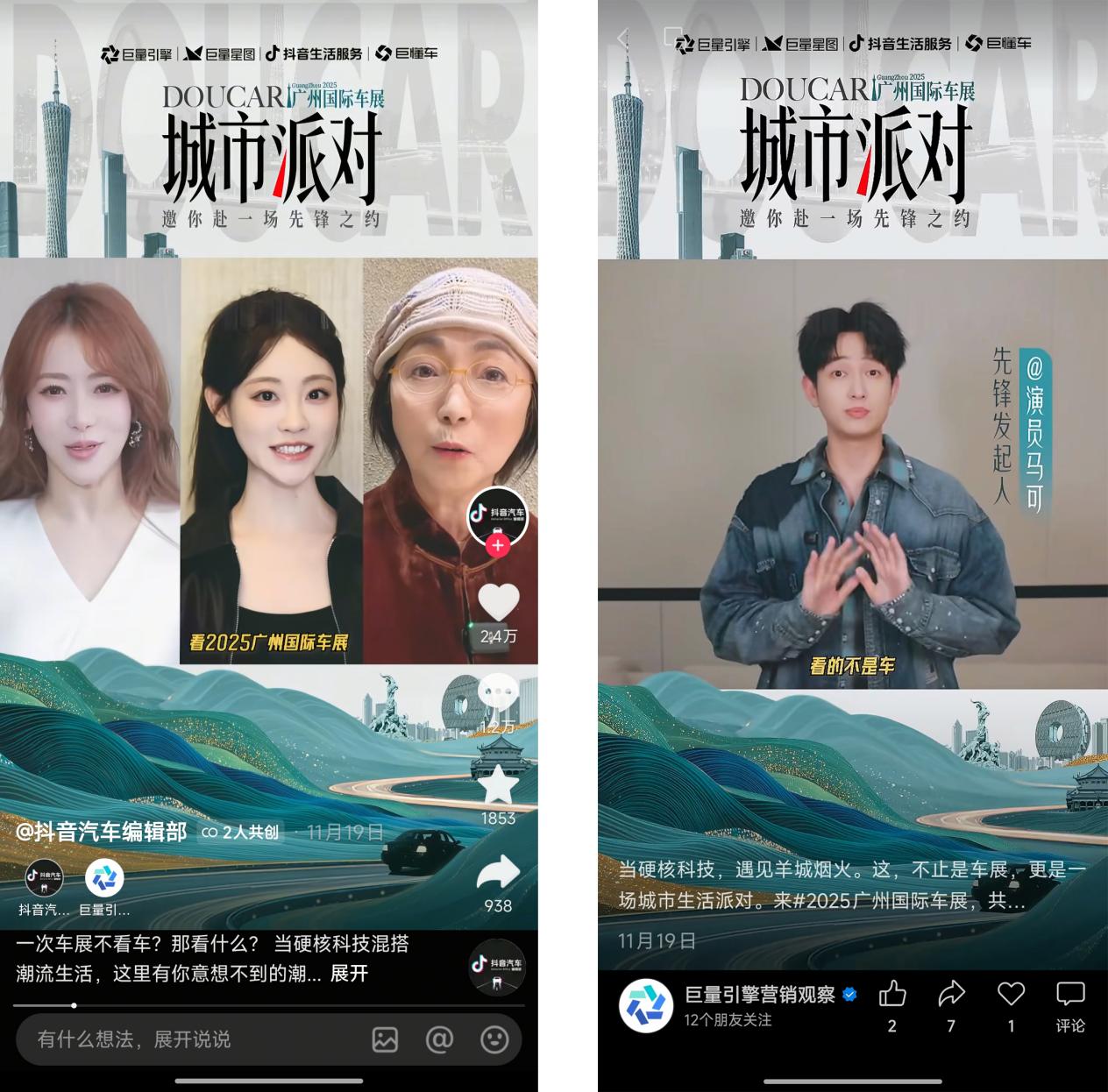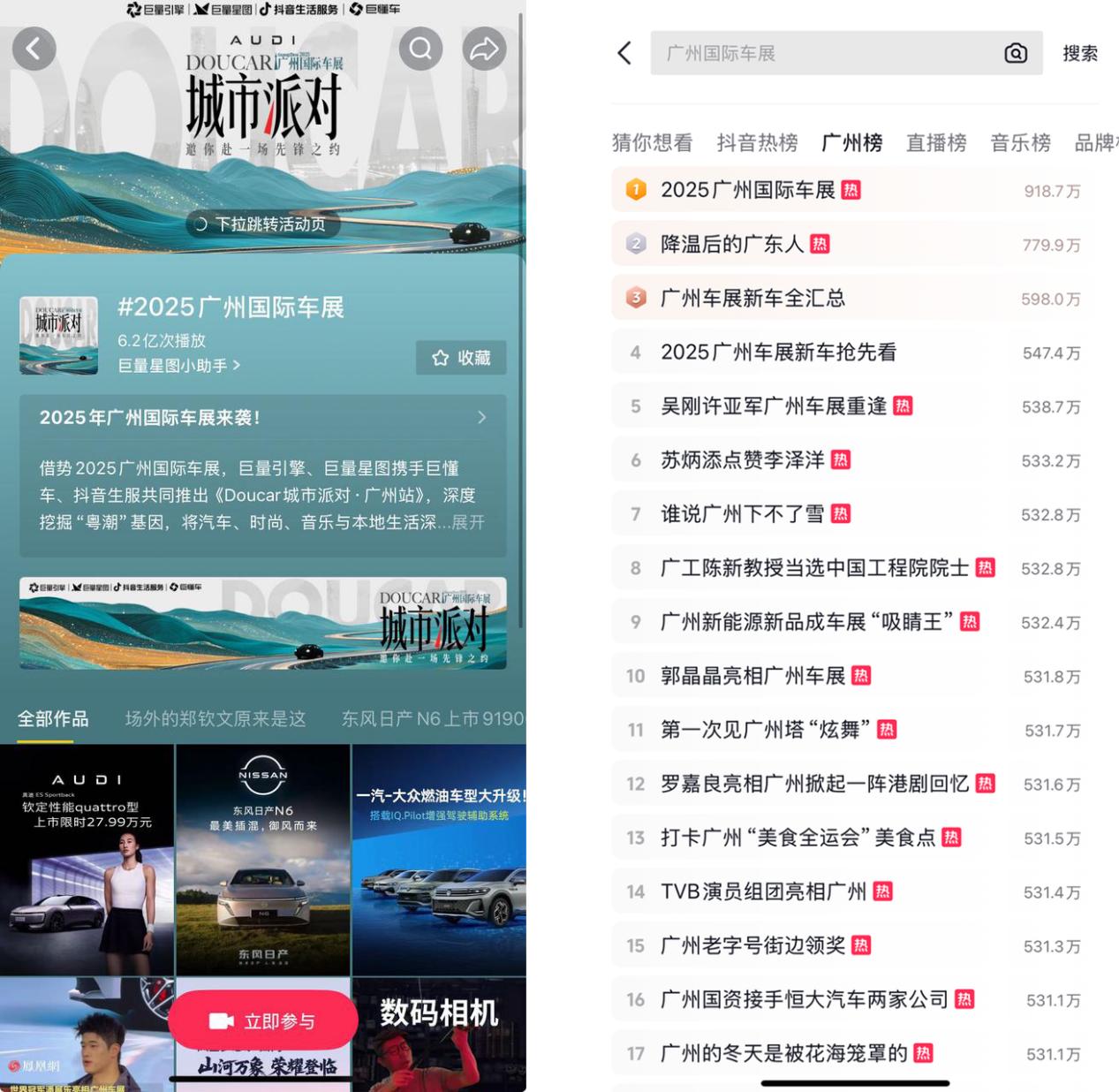 而在人群活跃的抖音平台,「Doucar城市派对」发起#2025广州国际车展# #赴一场先锋之约#等话题,植入品牌心智,再度串联起品牌、产品与用户互动,推动营销传播进一步裂变,实现对更广泛潜在人群的高效触达。截至目前,话题累计浏览量已超7亿次,更成功登顶抖音同城广州榜第一。