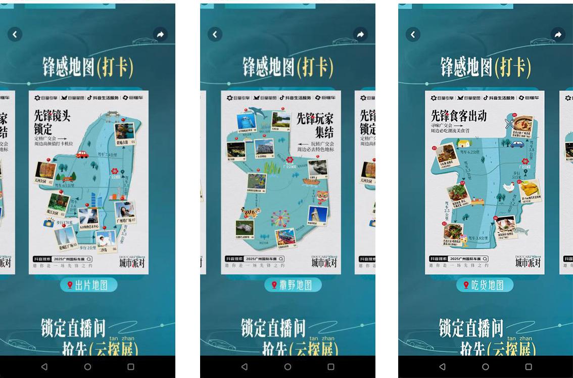 另一方面,「Doucar 城市派对」将车展与广州的城市景观深度融合,打造了 “先锋食客出动”“先锋玩家集结”“先锋镜头锁定” 等创意活动。游客在看完展馆内东风日产 N6 等重磅车型后,便能循着 “锋感地图”品尝特色美食、逛必去特色地标以及周边高颜值打卡机位。既贴合了广州人 “逛吃结合” 的生活习惯,也让车展体验更具烟火气与记忆点。
