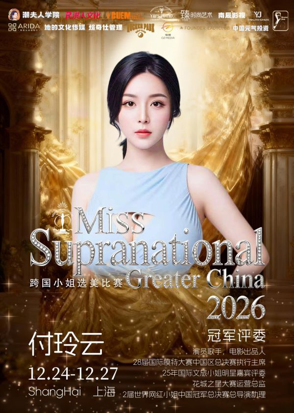 近日,由世界美丽协会(World Beauty Association)2009年创办的国际选美赛事,2026《跨国小姐(Miss Supranational)大中华区》总决赛,于2025年12月24日至27日在上海璀璨启幕。本届大赛主办单位:上海洪人文化传媒有限公司,上海瑜璟澜筱文化传播有限公司;联合主办:环球少儿精英模特大赛,东阳南辰影视公司;协办方:A9+国际俱乐部鼎力支持,汇聚全球时尚焦点,知名女歌手、演员付玲云受邀担任冠军评委,与成龙、白鹿、王力宏等国际巨星共同见证这一跨文化盛事。