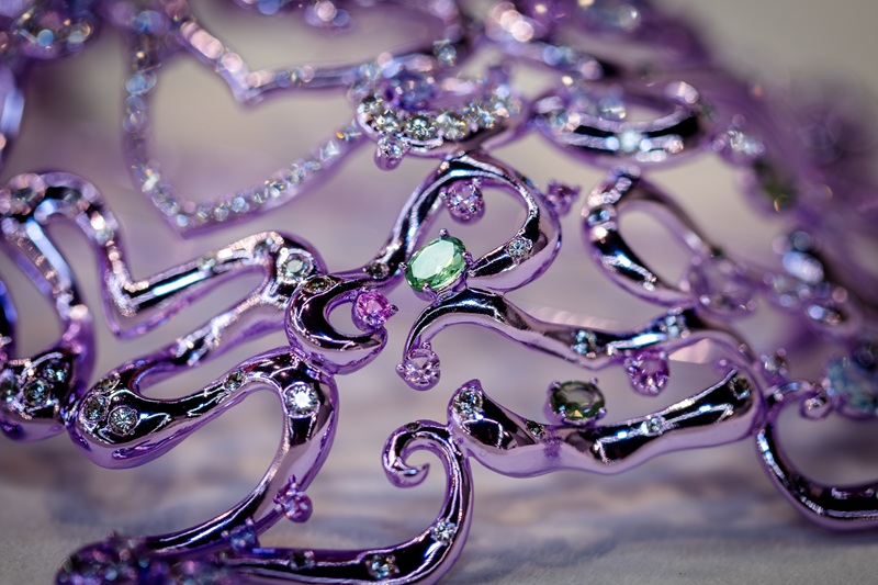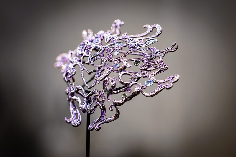 艺术总监紫晨敏锐捕捉到这份深邃的和谐,将其化为精妙的艺术珠宝。其创作超越形似的描摹,着力诠释气韵与动势的本真;凭借精湛的金工技艺,让钛金属材质焕发出鲜活的生命力。