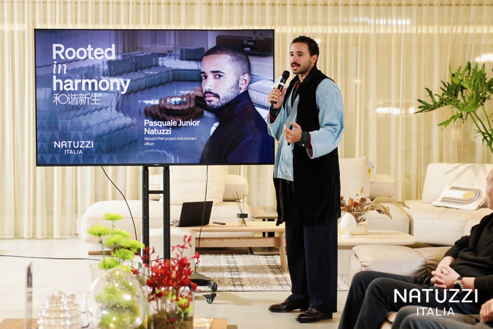 NATUZZI 全球商业项目首席官Pasquale Junior Natuzzi在分享中,系统阐述了这一发展历程:从沙发制造工厂,演进为与国际设计师紧密合作的设计品牌,直至今日致力于提供全方位“生活方式与室内设计解决方案”的完整路径。他表示:“‘Rooted in harmony‘不仅是一个年度主题,更是品牌过去11年‘Harmony Makers’理念的延续与升华。核心符号‘Radice’(意大利语,意为‘根’),象征着品牌66年来与意大利普利亚土地的深厚联结,也寄托着与用户、合作伙伴如家人般紧密共创的愿景。