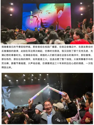 一位网名为“海内存知己”的歌迷,在歌友会后激动地在公众号写下长文感慨:这些老歌,就像一把把钥匙,打开了我记忆深处尘封已久的宝盒,每一首歌都承载着一段独特的青春故事,或甜蜜,或酸涩,或懵懂,或热烈。