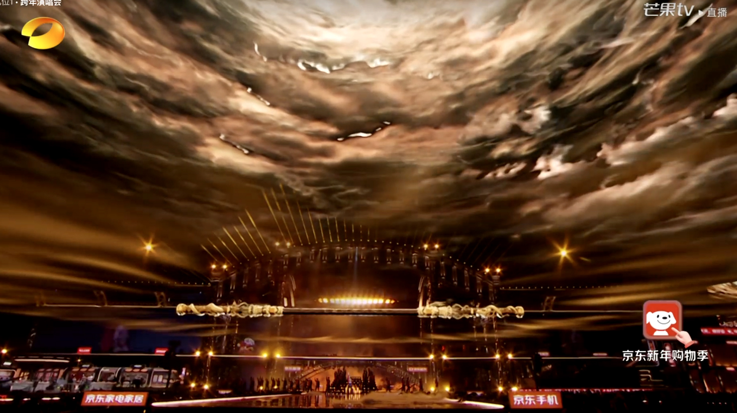 《将进酒》通过光影与AR虚拟影像的叠加,构建出“山峦—云海—行舟”的层次化意境空间。AR生成的写意云海则突破物理边界,将体育场转化为流动的山水画卷。其中“舟行云海”的意象,以超现实手法将古人置于悬置时空,形成历史与当下、实境与虚境的诗意对话,强化了节目文化穿越感的沉浸体验。