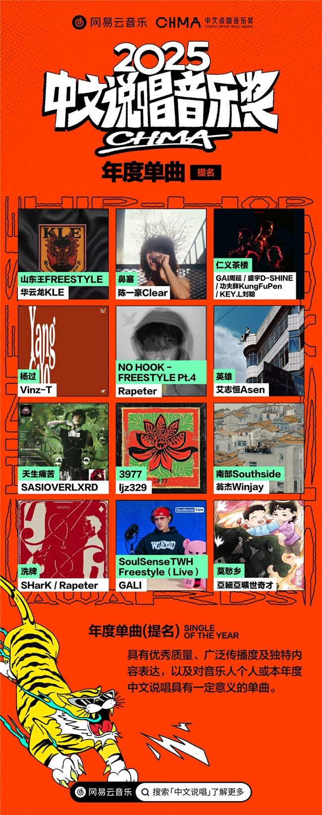 1月9日,网易云音乐2025中文说唱音乐奖提名名单正式发布。艾志恒Asen、陈一豪Clear、GAI周延、GALI、华云龙KLE、SHarK、泰格西、Vansdaddy、王齐铭、谢帝、张方钊等众多音乐人收获年度荣誉提名;陈娴静、Rapeter、TopBarry、翁杰Winjay等入围年度瞩目新星。获奖名单将于1月下旬正式揭晓。此外,所有入围作品已同步入选大众选择奖候选名单,乐迷可在网易云音乐APP搜索“中文说唱”,参与投票选出大众选择单曲及大众选择专辑。