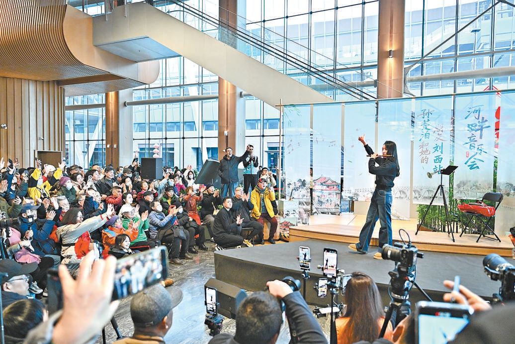 “唢呐一响,黄金万两,新的一年,我给大家添添喜气。”北京民族乐团唢呐演奏员王向阳熟练地向大家问了声好。昨天下午,通州区远洋乐堤港行人不断,一段《黄土情》在东区1层中庭里嘹亮吹响,很快,小舞台前便里里外外围了几层人,还有不少观众放慢脚步,从楼上好奇地向下张望:王向阳带三支唢呐上台,《百鸟朝凤》吹得酣畅淋漓,二胡演奏员孙晓煜弓弦急动,《赛马》气势奔腾,竹笛演奏员蒋锦雯用排箫吹起《月亮代表我的心》,温柔舒展。约一个小时的演出,喝彩连连,掌声不断,周末时光被音乐温暖点亮。