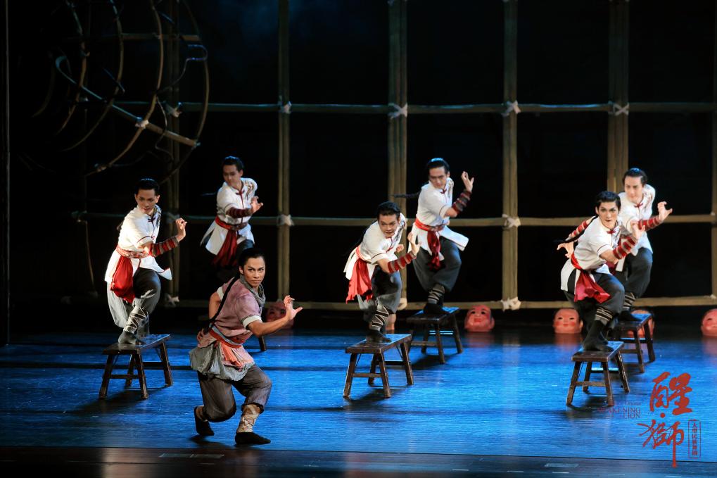 1月10日至11日,由广州歌舞剧院创排的舞剧《醒·狮》在醒狮起源地广东佛山巡演。18名男演员舞起9头威风凛凛的醒狮,站上鼓面向前迈进。霎时,灯光熄灭,舞台上出现了用竹片龙骨架搭建的巨型醒狮造型,它睁开双眼,目光如炬,全场掌声雷动、一片惊呼。