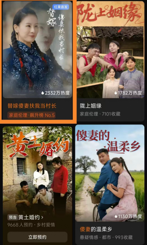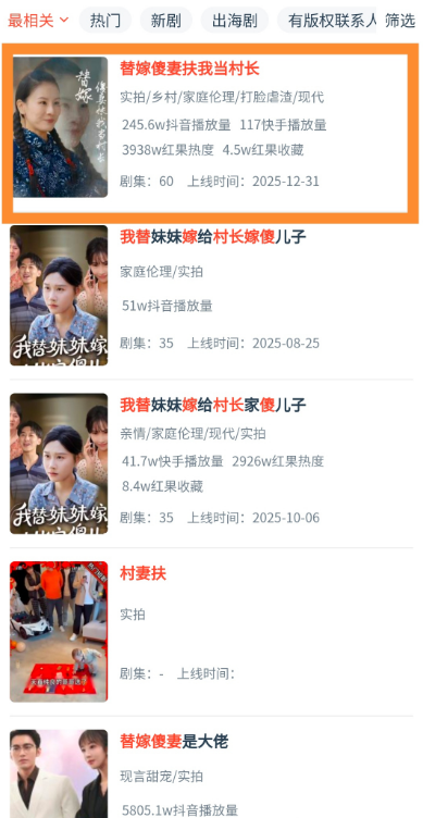 短剧《替嫁傻妻扶我当村长》自2025年12月31日在红果剧场和抖音上线以来,持续热播,连续10天霸占热播短剧榜位置,截止1月13日,抖音播放量超过245.6万,红果热度超过3938万,红果收藏量超过4.5万。