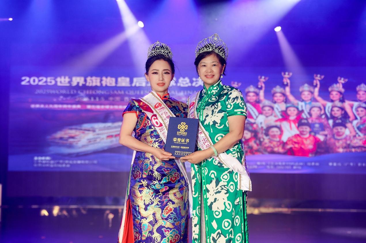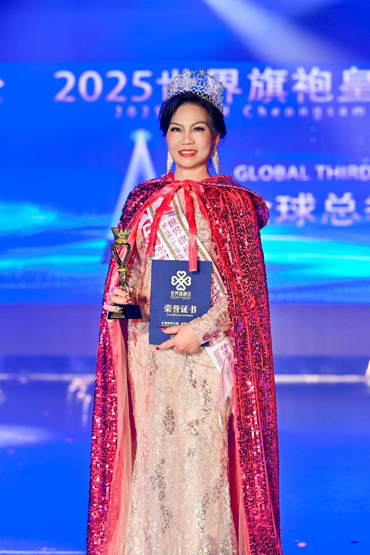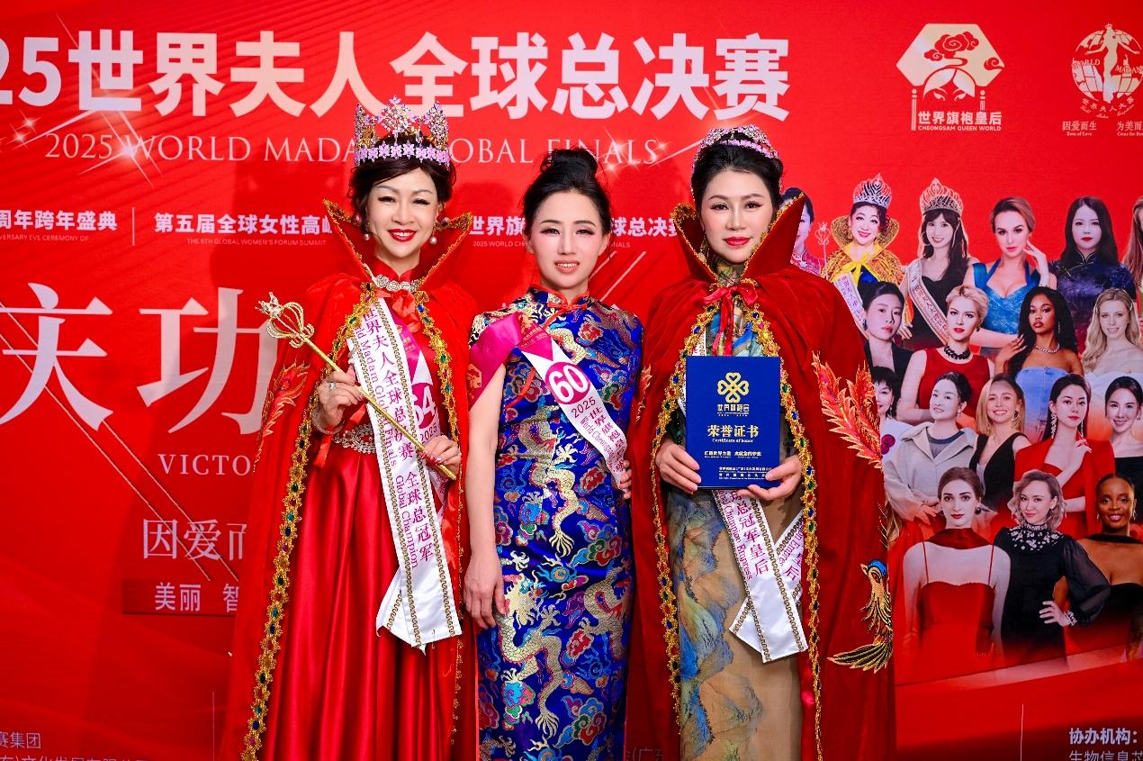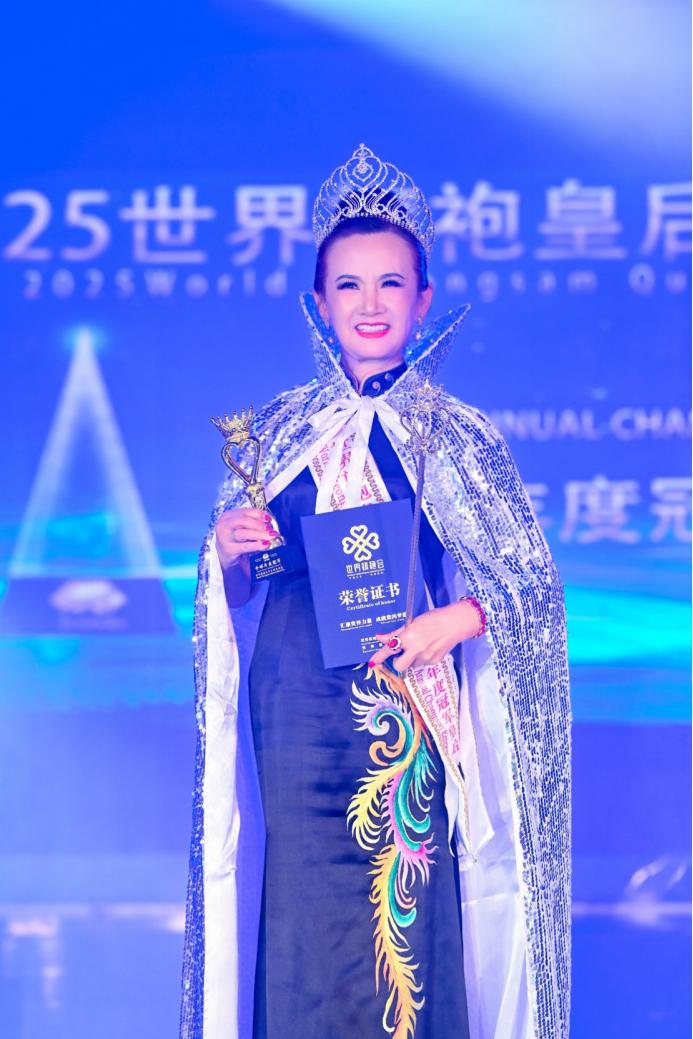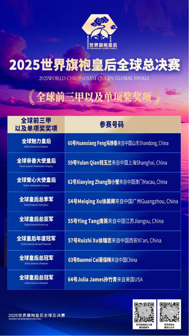 经过多轮激烈角逐,各项全球荣誉尘埃落定,杰出女性代表荣耀加冕:来自美国的华侨孙竹青(JuliaJames)斩获2025世界旗袍皇后全球总冠军同时也获得2025世界夫人全球总冠军成为本年度赛事双总冠军获得者;中国选手蔡保梅荣获世界旗袍皇后全球总冠军,徐瑞志摘得全球皇后年度冠军,唐英获全球皇后总亚军,徐美卿获全球皇后总季军,中国澳门选手张小瑩获得全球皇后爱心大使,钱玉兰获得全球皇后亲善大使,冯焕香获得全球魅力皇后。