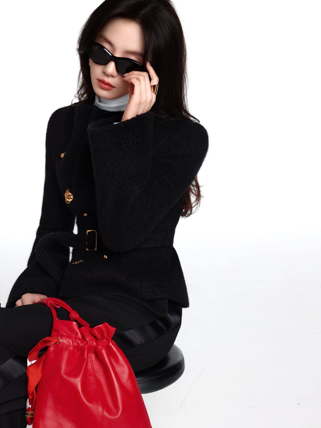 作为Celine全球品牌大使,刘诗诗的这场造型堪称教科书级别的法式极简范本。修身的黑色夹克利落收腰,同色系阔腿长裤垂坠感十足,腰带轻轻一收,便勾勒出流畅的身材线条。