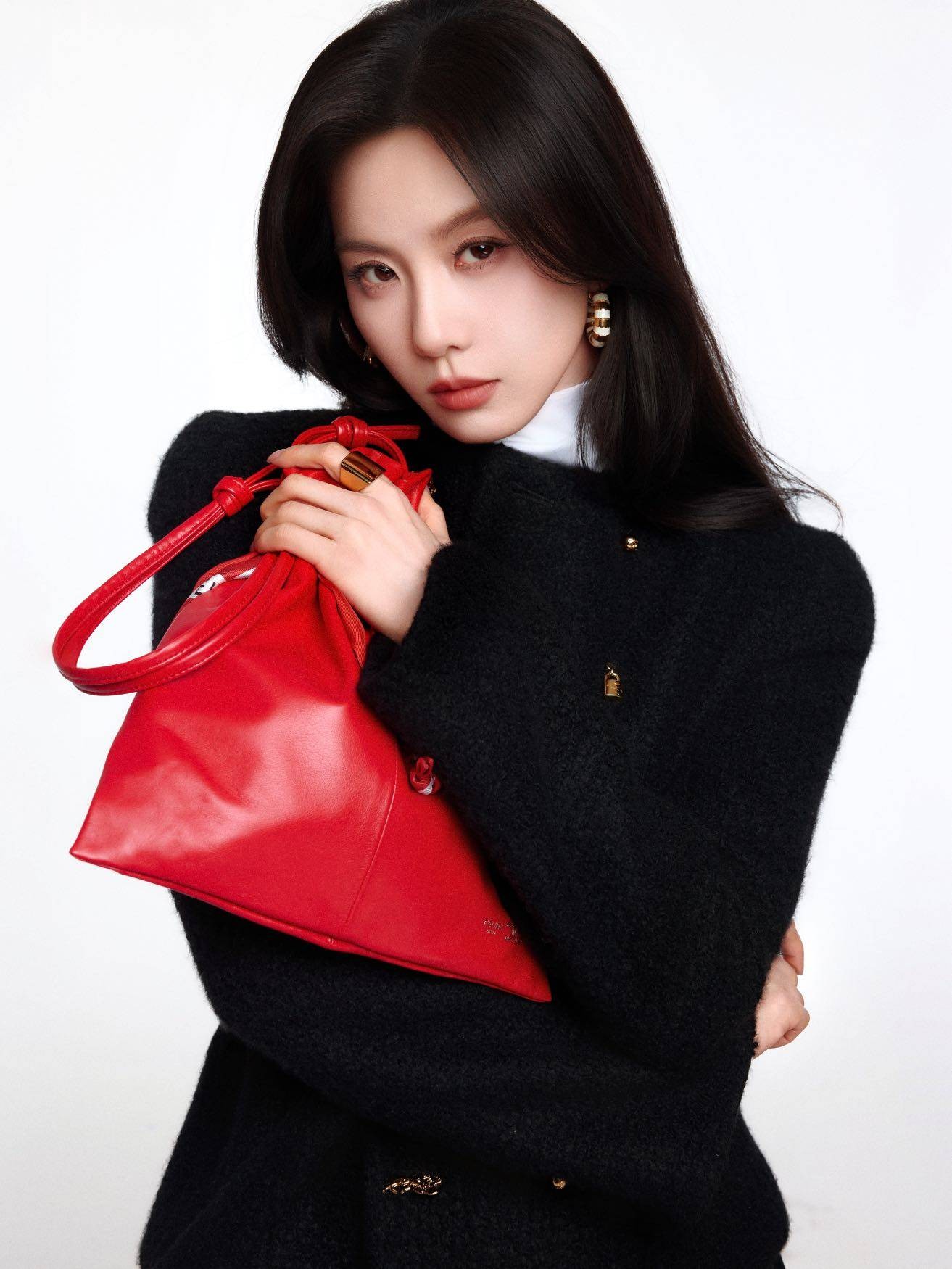 点睛之笔莫过于手中那只红色的CrystalPouch手袋。黑与红的冷暖碰撞,打破了全黑穿搭的沉闷,让整体造型瞬间鲜活起来。她站在夜色里,没有多余的装饰,却凭借优越的体态和清冷优雅的气质,把“行走的衣架”这个称号稳稳焊在身上。