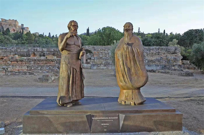 在雅典卫城脚下的古市集遗址,矗立着著名雕塑家吴为山创作的青铜组雕《神遇——孔子与苏格拉底的对话》。该片高度呼应雕塑的主题创作精神,吴为山先生为本片题名,授权在片中使用雕像,并出镜分享对跨文化交流的理解。