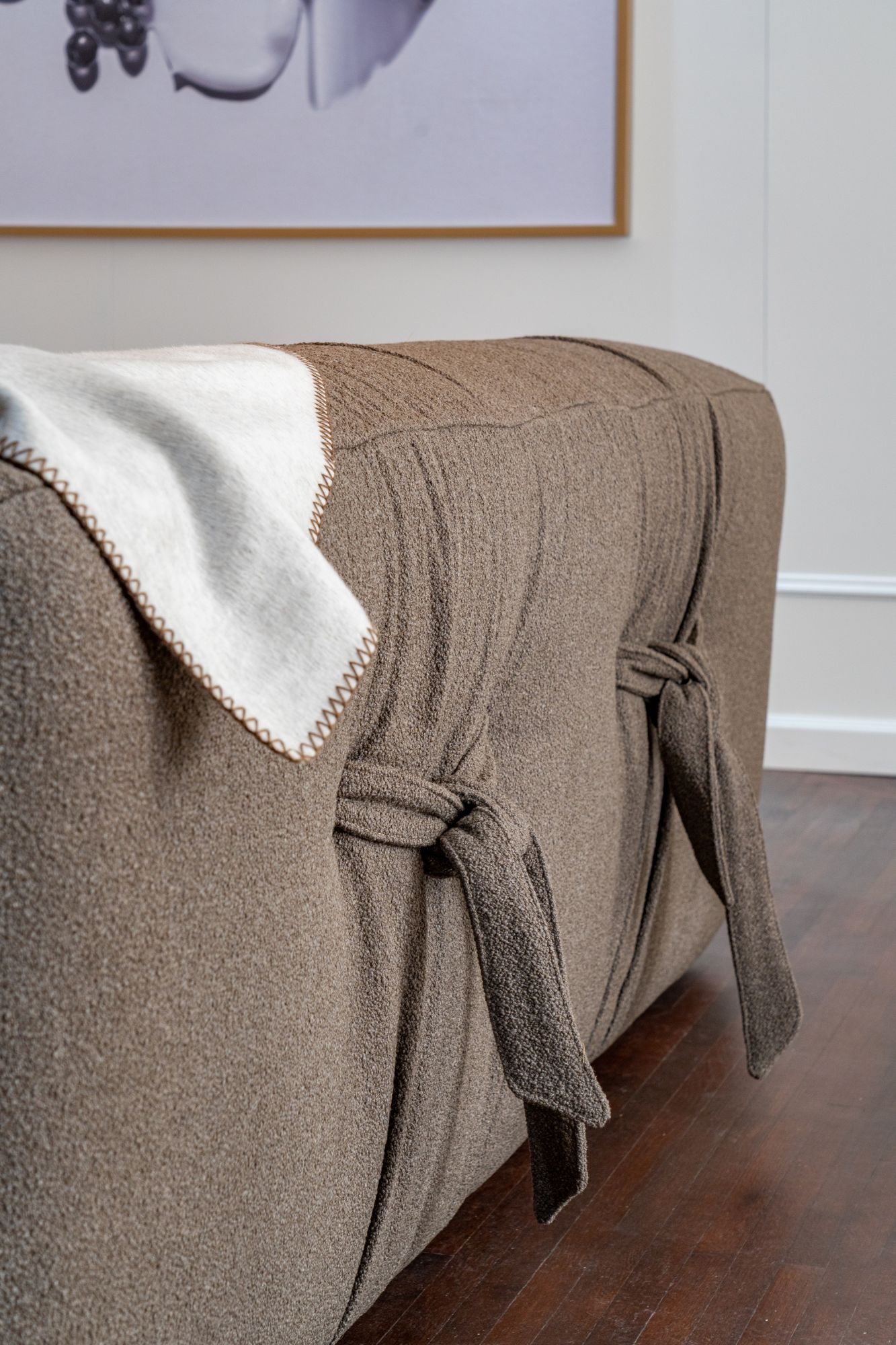 温润织物覆面的低饱和大地色系Argo沙发,点缀灵动古典蝴蝶绳结与匀称褶皱,搭配细腻绵软的羊毛盖毯,赋予细腻丰沛的适意坐感,与轻抚心灵的美观度。