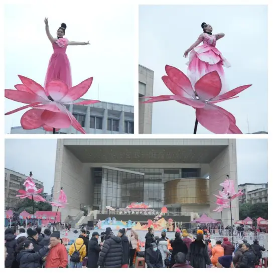 ·街头艺术盛宴:巨型荷花装置上,舞者身着粉裙翩然起舞,仿佛从花蕊中绽放的仙子;海灯武术演员踩着轻快步伐巡游,用海灯梅花桩武术绝活与观众互动;旗袍舞团手持团扇摇曳生姿,将东方美学融入街头。