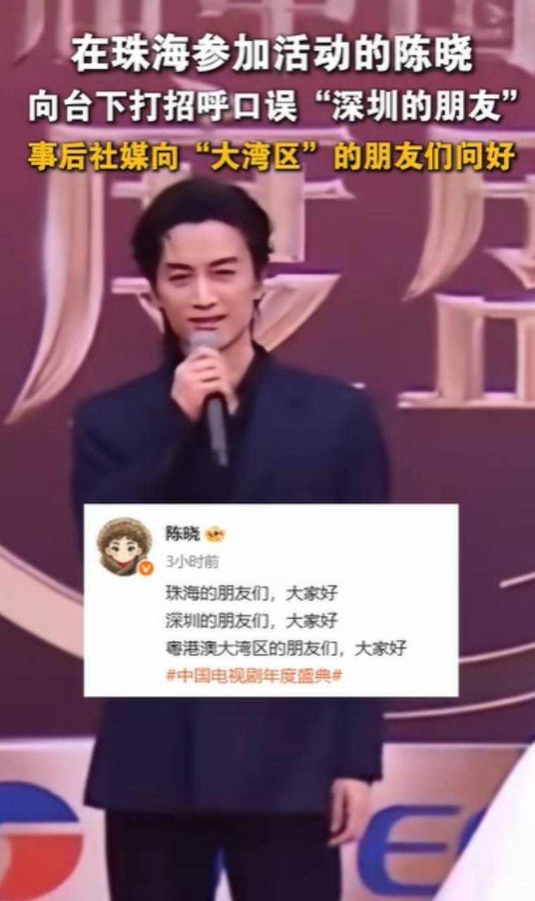 事后,陈晓在社交媒体上大方回应,向粤港澳大湾区的朋友们一致问好,轻松化解了这场红毯小插曲。
