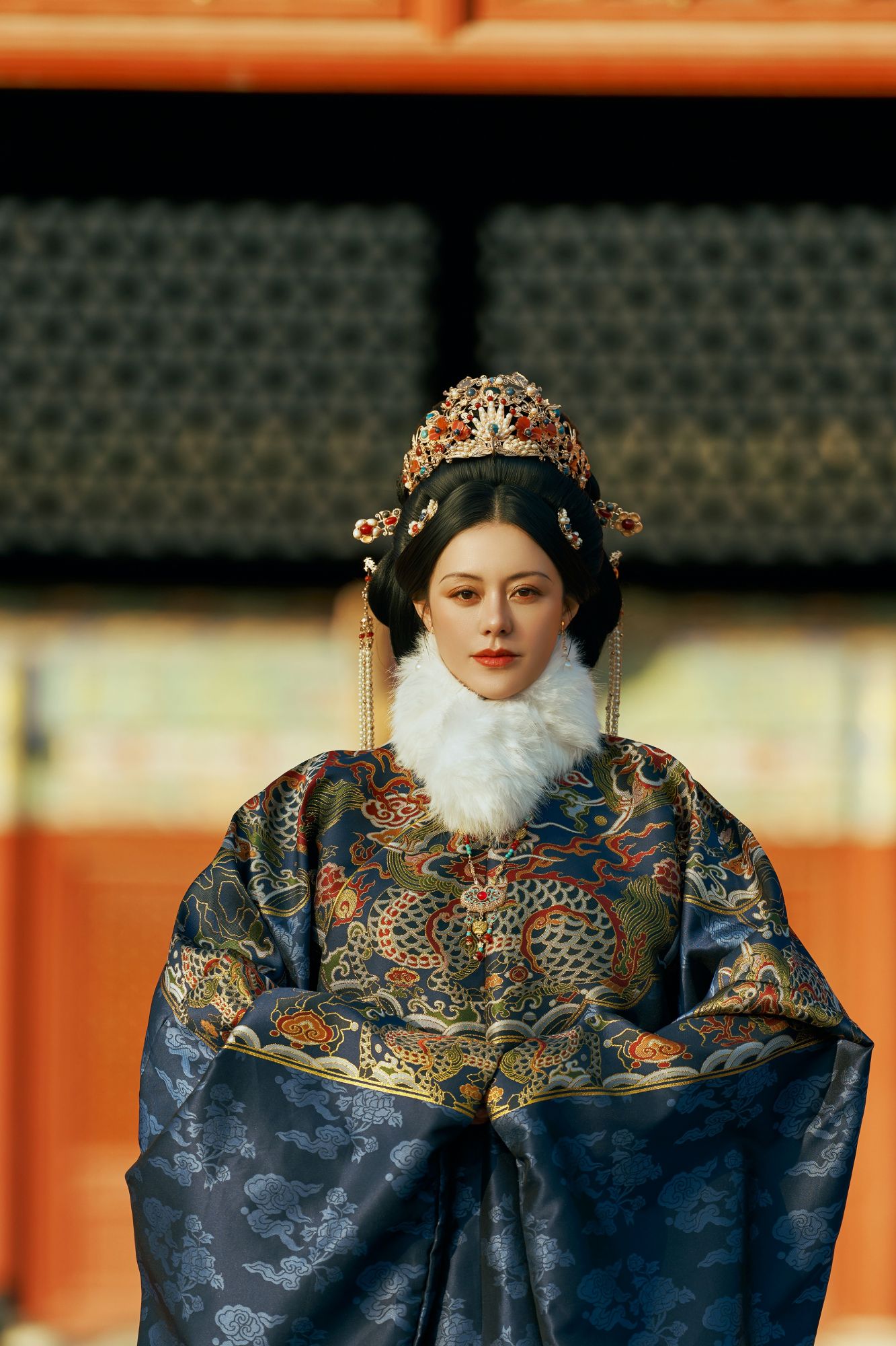 镜头前,她身着青色织纹锦袍,搭配雍容华贵的点翠头面,一袭白色毛领点缀其间,冷暖相衬,层次尽显。她的扮相既有世家主母的端庄大气,又兼具东方女性独有的温婉坚韧,手持书卷的姿态沉静而舒展,眉眼间流露着从容淡然的气度,巧妙将传统服饰的仪式感与当代女性的独立力量感相融,一颦一笑皆有古韵,一举一动尽展雅致。