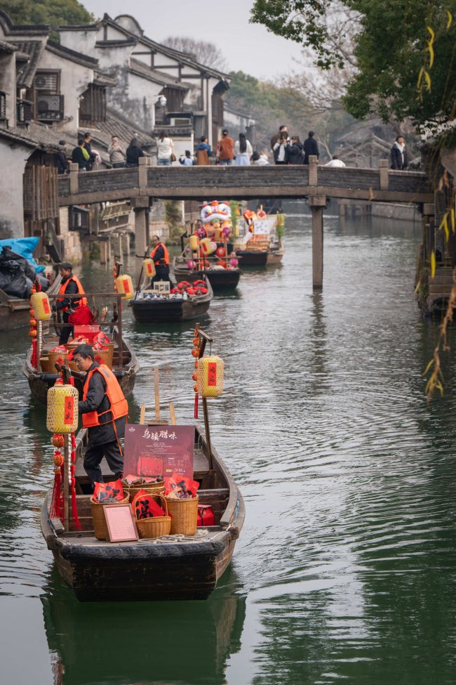 水上年货船:如意桥河道停靠,复刻水乡人沿河备年货的传统,张灯结彩的渡口,年味直接拉满