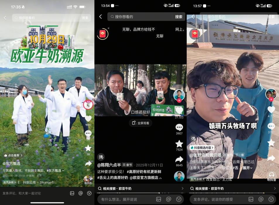 ②人设做实圈层突破:欧亚搭建了双轨并行的背书矩阵,10月安排头部IP东方甄选的产地直播带货,拉高品牌势能;12月云南本地百万级达人的加入,跟着@张舒克和黄贝塔打卡舌尖地图实地验证,看@陈翔六点半“打爆品牌”段子上线,都通过原生内容打破了圈层壁垒,让品牌声量突破了地域限制,实现了泛娱乐人群的精准触达。